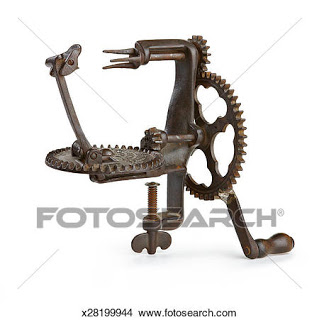 And so my Eureka moment became Leola’s, which strikes while she’s canning tomatoes with her mother one hot September afternoon. Looking up to a high shelf in their kitchen, she spots her grandmother’s old apple peeler-corer, which Mama nicknamed, The Apple Inquisitor, for it does resemble a torture device, with the spikes on one end to hold the piece of wood, and toothy gears for turning the shaft. Leola improvises a way to lock the shaft in place with a small butter knife, which can be removed easily so a different side of the piece can be worked. And, voila!, Papa’s Whittling Arm is born.